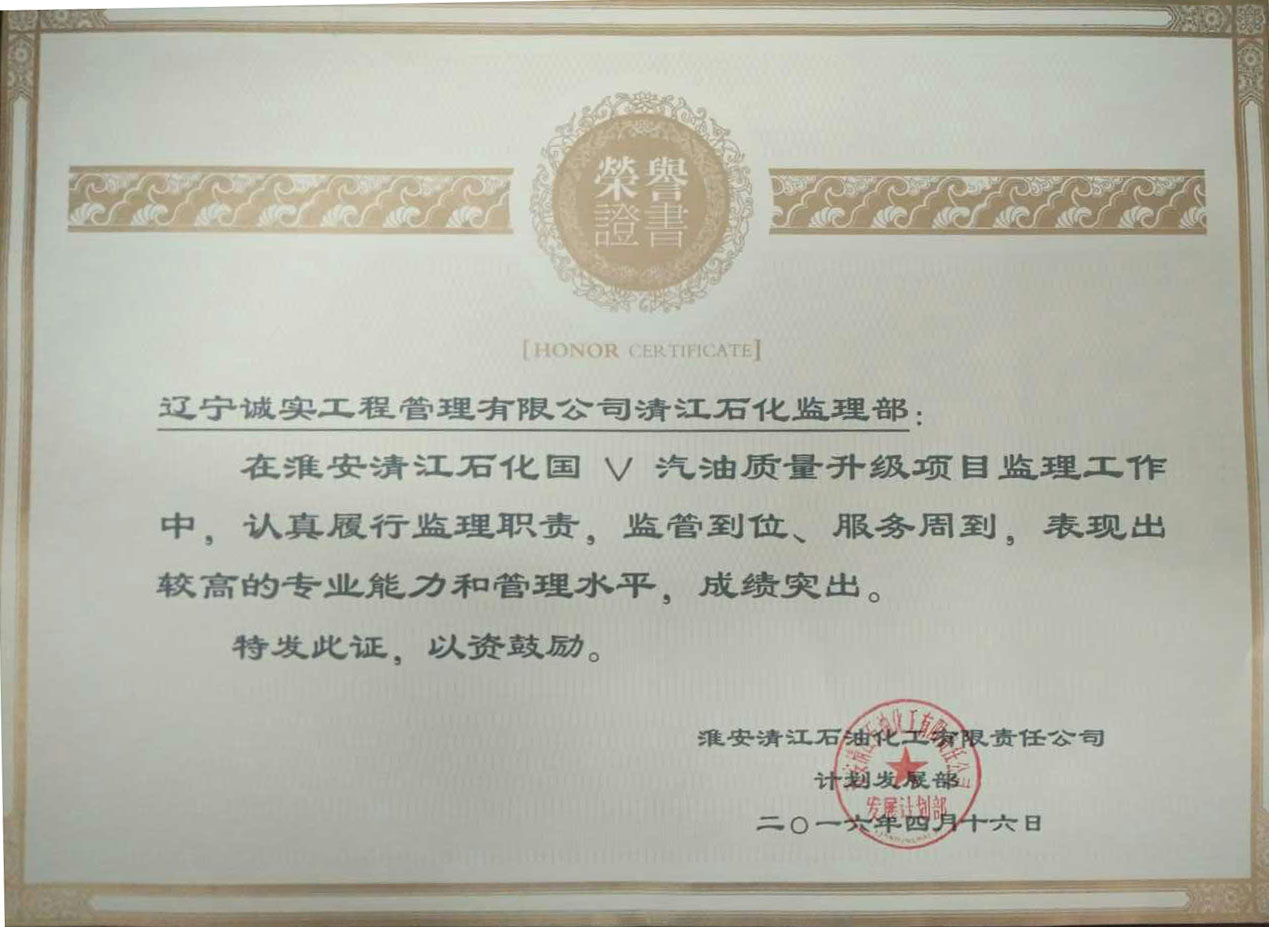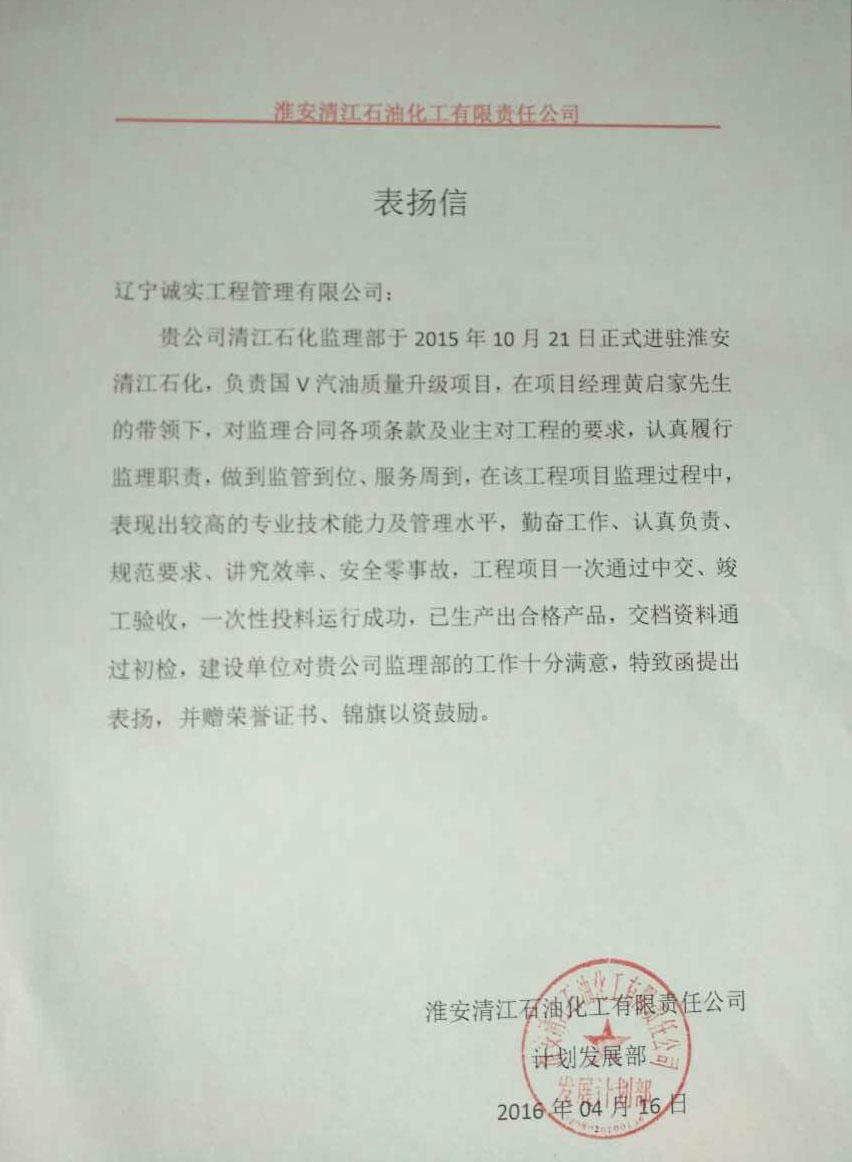 我乐鱼官方网站-乐鱼(中国)监理人员在“中石化淮安清江石油化工有限责任乐鱼官方网站-乐鱼(中国)国Ⅴ汽油质量升级项目”乐鱼官方网站-乐鱼(中国) 监理服务工作中,得到了建设单位的一致认可和肯定,对我们的工作表示十分满意,特发函提出表扬,并赠与荣誉证书、锦旗以资鼓励。