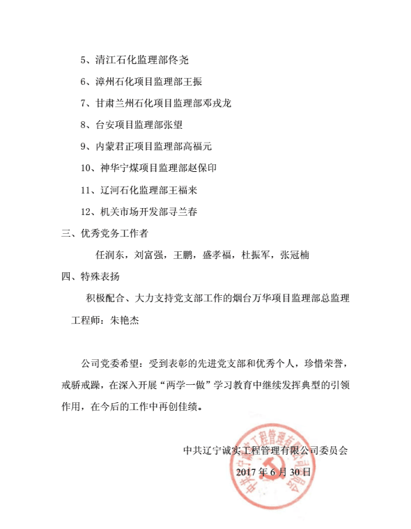 为庆祝中国共产党建党96周年,乐鱼官方网站-乐鱼(中国)党委于2017年6月30日下午在乐鱼官方网站-乐鱼(中国)一楼会议室召开了庆祝建党96周年暨“一优两先”表彰视频大会。乐鱼官方网站-乐鱼(中国)机关、抚顺各项目监理部及在抚的党员同志在主会场参加了大会,中海油惠州项目监理部党支部、甘肃华亭项目监理部党支部、宁夏石化项目监理部党支部、中化泉州项目监理部党支部、广西石化项目监理部党支部、兰州石化项目监理部党支部、内蒙古君正项目监理部党支部、神华宁煤项目监理部党支部、烟台万华项目监理部党支部设立视频分会场。党委委员马骏主持了视频大会。首先,乐鱼官方网站-乐鱼(中国)党委副书记冯玉琢同志宣读了“一优两先”表彰决定。接着,党委书记孙学良结合乐鱼官方网站-乐鱼(中国)实际做了庆祝建党96周年的讲话。最后全体党员重温的入党誓词,进行入党宣誓。