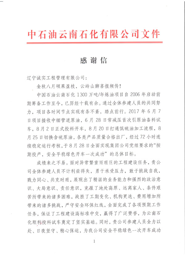 我乐鱼官方网站-乐鱼(中国)于今日收到由中国石油云南石化有限乐鱼官方网站-乐鱼(中国)发给我方的《感谢信》一封,信中提到:对于我方所监理服务的炼油项目自2006年启动筹备工作至今,我方监理人员不计利益得失,勇于承受压力,使得该项目近日顺利投产试车成功。对于我单位的工作给予极大的肯定以及衷心的感谢。对方还提到:希望双方在日后的共同发展中,互惠互利,共赢发展。