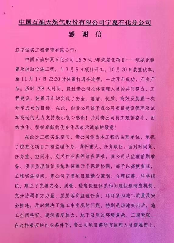 信中,中国石油天然气股份有限乐鱼官方网站-乐鱼(中国)宁夏石化分乐鱼官方网站-乐鱼(中国)对我乐鱼官方网站-乐鱼(中国)及项目监理人员的工作十分满意,给予了很高的评价与肯定,并表示衷心的感谢。