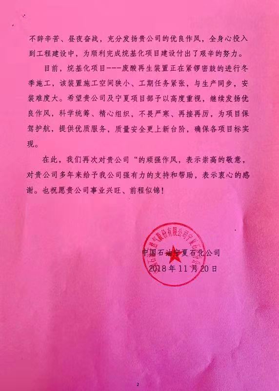 2018年11月20日,我乐鱼官方网站-乐鱼(中国)收到了一封来自业主——中国石油天然气股份有限乐鱼官方网站-乐鱼(中国)宁夏石化分乐鱼官方网站-乐鱼(中国)的感谢信。