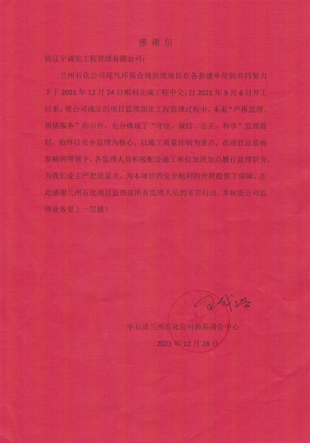 12月28日,兰州项目监理部收到中石油兰州石化乐鱼官方网站-乐鱼(中国)油品调合中心发来的感谢信。信中,业主单位对项目部全体监理人员在项目开展过程中的工作表现给予了充分的肯定和高度的赞誉。这是对我乐鱼官方网站-乐鱼(中国)卓越的项目管理水平和强大的人才队伍的最好见证,同时也完美的展现了我们一贯以来“敢打硬仗、善打难仗、能打胜仗”的优良传统和作风。希望各项目部要以此为动力,不忘初心,牢记使命,担当作为,为树立诚实品牌、打造诚实形象再立新功!