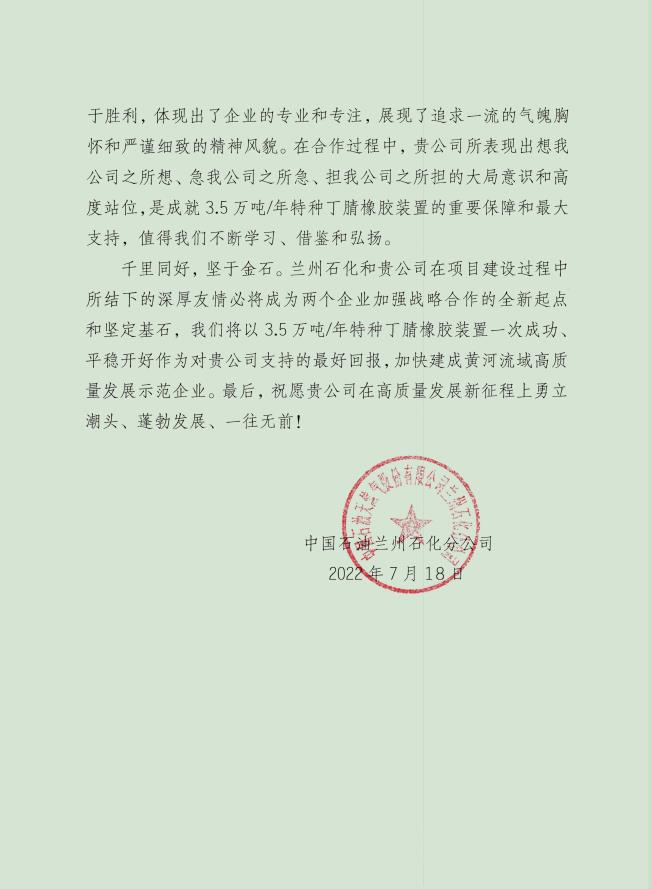 近日,由我乐鱼官方网站-乐鱼(中国)监理的中国石油天然气股份有限乐鱼官方网站-乐鱼(中国)兰州石化分乐鱼官方网站-乐鱼(中国)--3.5万砘/年特种丁腈橡胶项目喜获业主表扬信。表扬信充分肯定了诚实监理的工作成果,对驻兰州项目部全体监理乐鱼官方网站-乐鱼(中国) 师在项目建设过程中所付出的努力表示由衷的感谢。