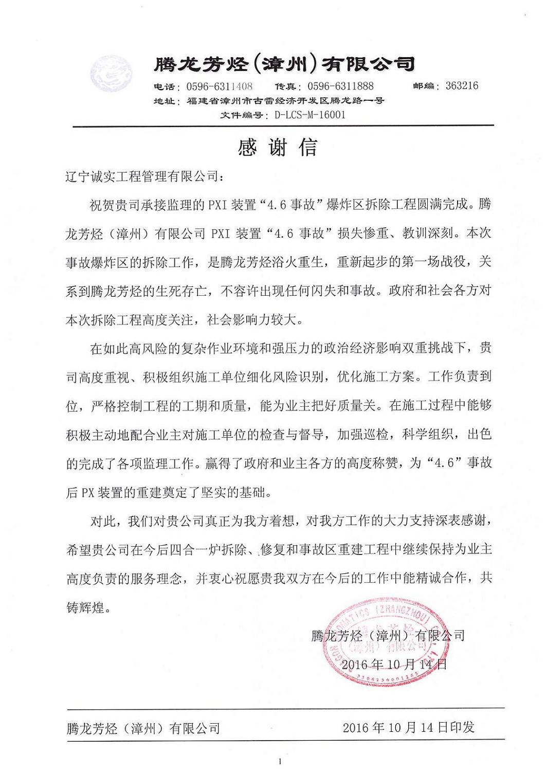 我乐鱼官方网站-乐鱼(中国)监理人员在“腾龙芳烃(漳州)有限乐鱼官方网站-乐鱼(中国)PXI装置4.6事故爆炸区拆除”乐鱼官方网站-乐鱼(中国) 监理服务工作中,得到了业主单位的认可和肯定,对我们的工作表示十分满意,特发感谢信提出表扬。