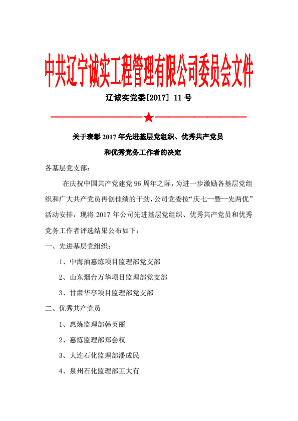 为庆祝中国共产党建党96周年,乐鱼官方网站-乐鱼(中国)党委于2017年6月30日下午在乐鱼官方网站-乐鱼(中国)一楼会议室召开了庆祝建党96周年暨“一优两先”表彰视频大会。乐鱼官方网站-乐鱼(中国)机关、抚顺各项目监理部及在抚的党员同志在主会场参加了大会,中海油惠州项目监理部党支部、甘肃华亭项目监理部党支部、宁夏石化项目监理部党支部、中化泉州项目监理部党支部、广西石化项目监理部党支部、兰州石化项目监理部党支部、内蒙古君正项目监理部党支部、神华宁煤项目监理部党支部、烟台万华项目监理部党支部设立视频分会场。党委委员马骏主持了视频大会。首先,乐鱼官方网站-乐鱼(中国)党委副书记冯玉琢同志宣读了“一优两先”表彰决定。接着,党委书记孙学良结合乐鱼官方网站-乐鱼(中国)实际做了庆祝建党96周年的讲话。最后全体党员重温的入党誓词,进行入党宣誓。