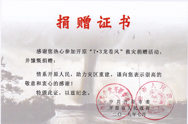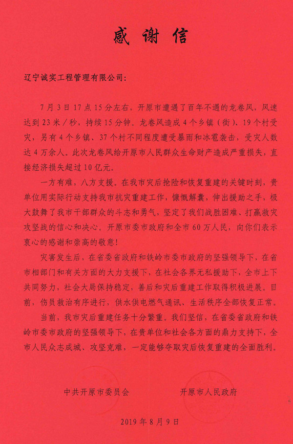 2019年7月3日一场可怕的龙卷风席卷了辽宁省开原市,据初步统计,这场灾害共造成6人死亡、190余人受伤、2.8万人受灾,房屋受损6451户,农业大棚受损25栋,农田受灾14.6万亩,100余万平方米厂房遭受严重损坏,造成直接经济损失约10.75万元。灾情发生后,省委、省政府及省住建厅领导高度重视,号召全省监理企业为此次灾情捐款。龙卷风无情,人有情。为了帮助受灾同胞共渡难关,我单位积极响应省委、省政府、省建设厅以及省协会的号召,在第一时间捐款3000元。参与此次捐款的省监理单位共计近30家,捐款数额从500元至20000元不等。事后,开原市委、开原市政府为我单位颁发了感谢信以及捐赠证书。