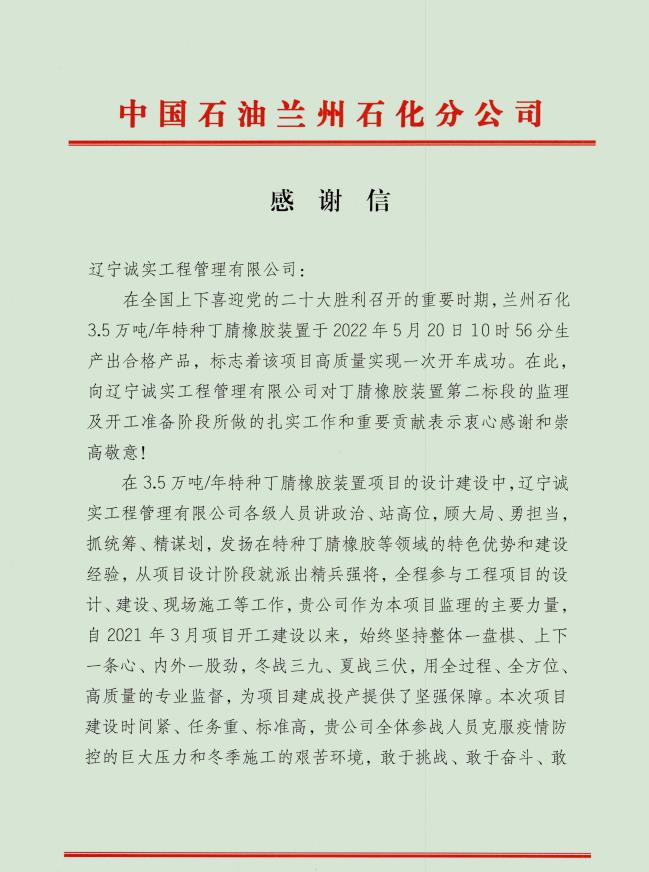 近日,由我乐鱼官方网站-乐鱼(中国)监理的中国石油天然气股份有限乐鱼官方网站-乐鱼(中国)兰州石化分乐鱼官方网站-乐鱼(中国)--3.5万砘/年特种丁腈橡胶项目喜获业主表扬信。表扬信充分肯定了诚实监理的工作成果,对驻兰州项目部全体监理乐鱼官方网站-乐鱼(中国) 师在项目建设过程中所付出的努力表示由衷的感谢。