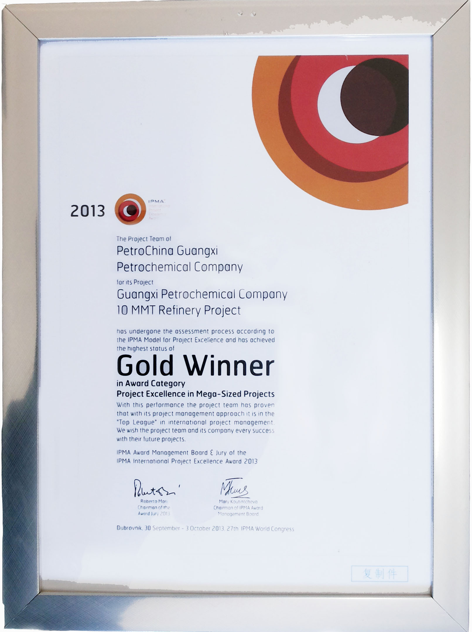 10月2日,从克罗地亚杜布罗夫尼克传来一个令人振奋的消息,在当地举行的第27届IPMA国际项目管理大会上,我乐鱼官方网站-乐鱼(中国)监理的广西石化千万吨炼油项目以最高得分,从澳大利亚海水淡化项目、印度HPCL—MITTAL能源乐鱼官方网站-乐鱼(中国)GGS炼油项目等14个入围项目中脱颖而出,荣获了IPMA国际卓越项目管理最高奖项—特大型项目金奖。这是继神舟六号载人飞船项目(2006,第20届)、中海油惠州炼油项目(2010,第24届)之后,中国第3个获此殊荣的特大型项目。