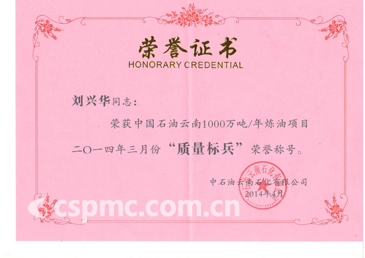 热烈祝贺刘兴华同志荣获中国石油云南1000万吨/年炼油项目2014年3月份“质量标兵”荣誉称号!