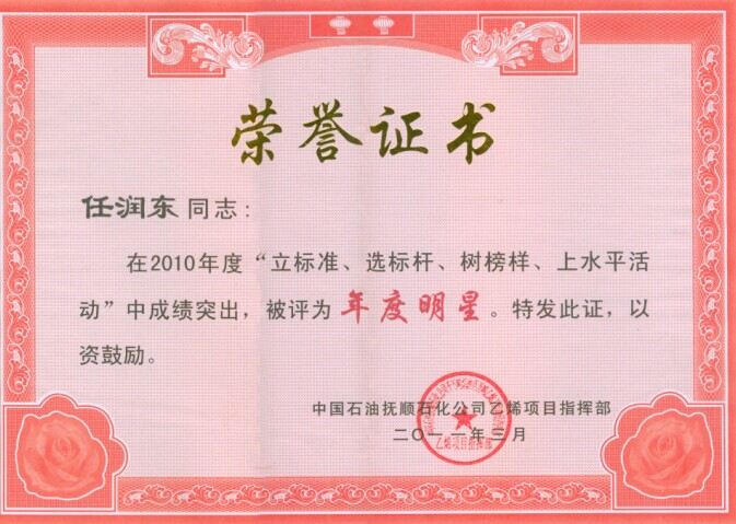 任润东同志被中国石油抚顺石化乐鱼官方网站-乐鱼(中国)乙烯项目指挥部评为年度明星