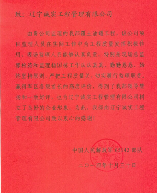 信中,中国人民解放军65142部队对我乐鱼官方网站-乐鱼(中国)及项目监理人员表示衷心的感谢。我乐鱼官方网站-乐鱼(中国)项目监理人员能够认真负责地工作,切实履行监理职责,并且对该项目的总监理乐鱼官方网站-乐鱼(中国)