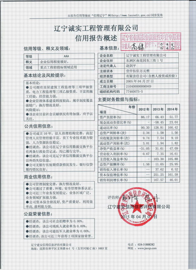2015年4月,经辽宁建安信用信息评估有限乐鱼官方网站-乐鱼(中国)信用评级委员会的评定,我乐鱼官方网站-乐鱼(中国)被确定为最高信用等级“AAA”级。